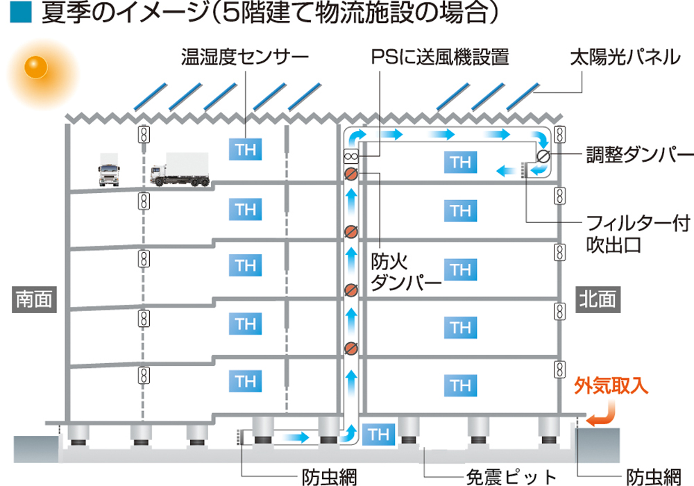 また、地下免震ピット内の安定した温度の空気を利用し、予冷を行う空気還流システムなどを採用する。庫内を監視するテレビカメラ(ITV)の設置やLEDの採用、さらには太陽光発電システムの採用も行っている。