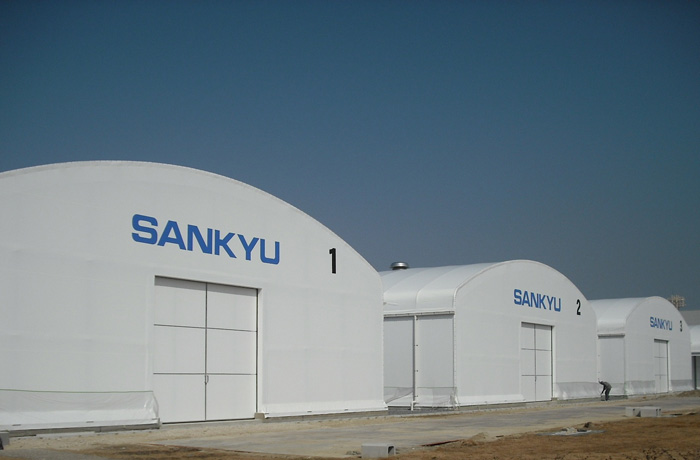 倉庫仕様:テント型倉庫6棟(常温倉庫5棟、定温倉庫1棟)