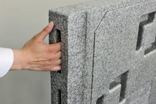特徴は側面のスリット状の指穴で、フォークによる荷積み作業は手でスペーサーを支えておくことが必要になるが、その際に発生する荷物とスペーサーの間で指を挟んでしまう事故の危険性を、指穴を利用して支えることで完全になくすことができる。