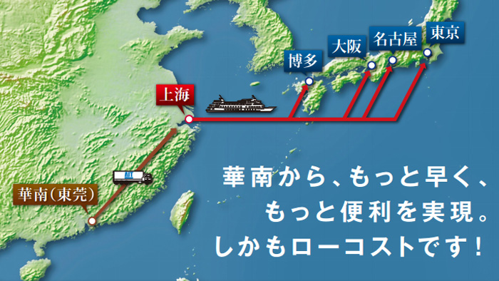 華南から上海への陸上輸送と、上海から日本への海上輸送を組み合わせる事で「スピード」「便数」をアップし、ローコストを実現した。