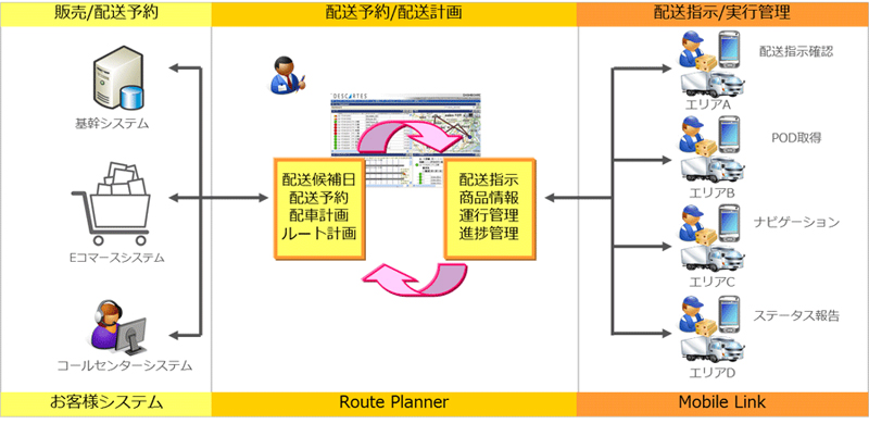 受注と同時に、システムが効率的な配送ルートを自動で作成し、配送担当者をはじめ関係者全員はPCやスマートフォンを使って情報共有が可能となっている。