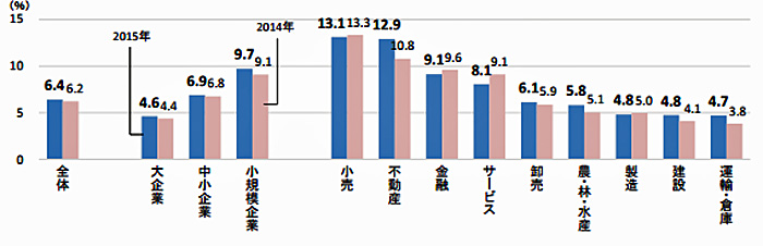 最も高いのは小売業が13.1%、不動産業12.9%、金融9.1%の順となっている。