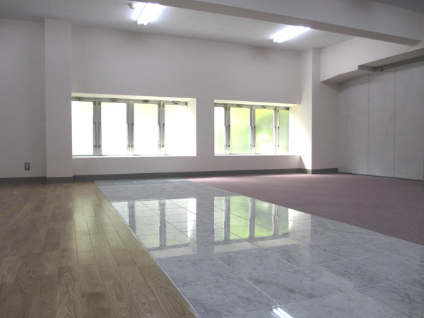 <床面に傷を付けずに搬送する技法習得用に設置された3種類の床。左からフローリング、大理石、カーペット。>
