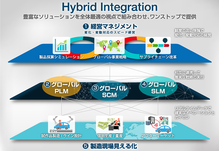 構成ソリューションは、経営マネジメント、グローバルPLM、グローバルSCM、グローバルSLM、製造現場見える化。