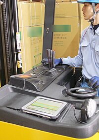 タブレット端末は、ディスプレイのサイズが7インチと10インチの2種類の端末を導入しており、大型家電のピッキングを行うフォークリフトには10インチの端末を、付属品や消耗品といった小型商品のピッキングを行うカート(台車)には7インチの端末を搭載している。