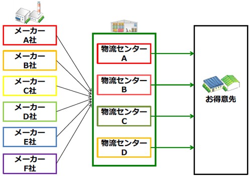 4か所の配送拠点を2か所に集約、共同保管し、各々の配送拠点から共同配送を行うことで一台当たりの積載効率を高める。
