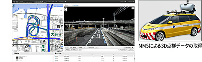 MMSは、通常のクルマと同様に走行し、道路規制なしで道路構造物などの高密度点群を線的に整備することが可能。