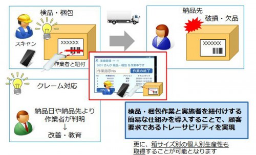 また、担当作業者と対応商品の紐付けができているため、商品納品後に破損などの問題が生じた場合、原因を追跡できるトレーサビリティ機能としても活用できる。原因が判明することで的確な対応や改善教育も行いやすく、品質の向上に繋がる。