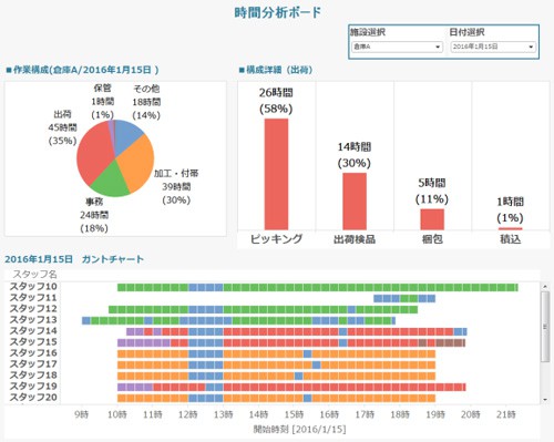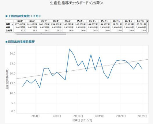 さらに「ろじたん」で取得した作業時間データと、WMS(倉庫管理システム)から取得した作業実績データを連携させることで、出荷生産性やピッキング生産性といった物流KPIを瞬時にひと目でわかるようビジュアル化して示す。