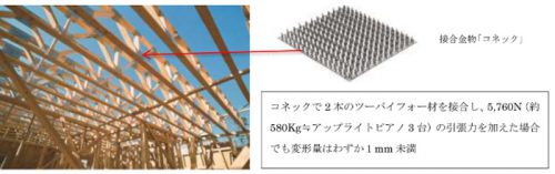 鉄骨トラスと比較しても強度には遜色なく、熱による変形が少ない点は鉄骨より優れており「コネック」もステンレスSUS-430を採用し錆びにくく、さらに重量も軽いため建物全体の荷重を軽くでき、耐震性能の高い建物となる。
