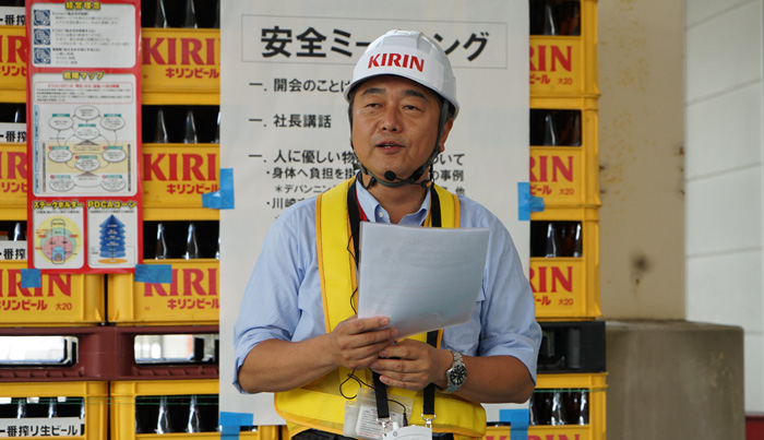 加藤元社長は「キリン品質を担保するにはまず安全が第一と考えている。商品に優しく、社会に優しくすることは、自分にも優しくすることが原点だ。物流現場では腰痛などにつながる労働災害も多い。ロボットスーツを試験導入したのもその解消策の一つ。酷暑の季節となるが、一人一人の健康に留意しながら、キリン品質を守るために現場力を高めていきたい。コストと時間はかかるが、それがキリン品質を守り、ブランド力を上げる方法だ」と話した。