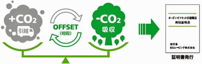 引越輸送で発生するCO2について、顧客が追加費用を負担することなく、SGムービングがカーボン・オフセットを行う。