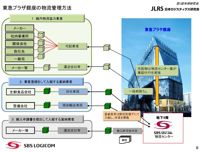 SBSロジコムは10月11日、日本ロジスティクス研究会(JLRS)が開催した第3回事例研究会において、顧客である東急不動産が運営する東急プラザ銀座の館内物流の現場見学と取り組みを発表した。