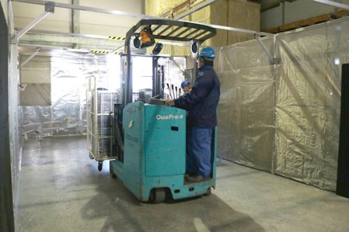 <フォークリフトにICタグをつけた製品を載せて、ゲートを通ると、一括で必要な情報が読み取れる。>
