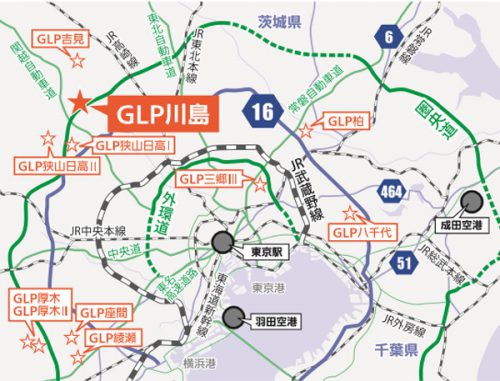 昨年3月に着工した延床面積4万8899m2(メザニンを追加した場合:約5万4000m2)の4階建て物流施設で、圏央道川島ICに隣接し、関越自動車道、東北自動車道への接続にも至便な上に国道16号線と254号線も利用可能な好立地に所在する。