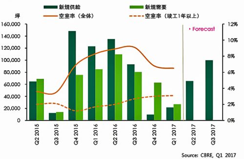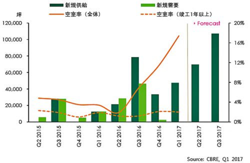 結果として、エリア間の格差は一段と拡大している。また、今期の新規需要は2万7000坪と、2015年Q3以来の低水準となった。