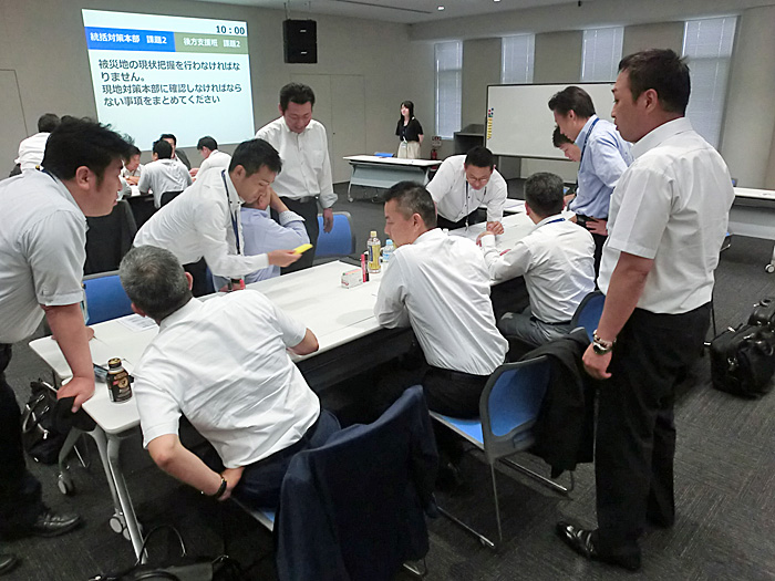 本社に設置する統括対策本部、発災地の拠点に設置する現地対策本部のほか、今回から新たに被災地への人的・物的支援に特化した活動を行う後方支援班を組織して、従業員の家族を含めた安否確認や安全確保を最優先にしつつ、24時間以内に業務を再開出来るよう、迅速で適切な指示を行う訓練を行った。