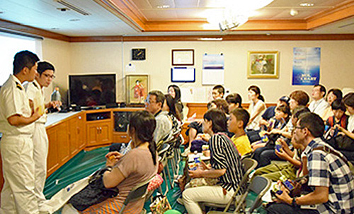 ブリッジでは海図や船を操縦する計器などを船長・航海士が判り易く説明を行ったほか、ラウンジではエンジンの仕組みやエンジニアの仕事をクイズ形式で軽妙に説明したり、船で使用する燃料の実物を参加者に見せたりと、笑顔溢れる時間となった。
