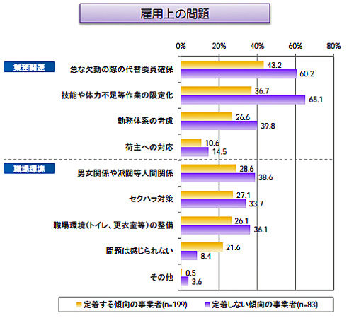 雇用上の問題では、定着傾向にある回答者と比較して定着傾向にない回答者は、全ての項目において「問題である」と感じている割合が高くなっている。