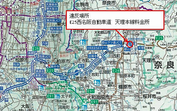 2016年8月20日に、E25西名阪自動車道天理本線料金所(奈良県大和郡山市新庄町)において、道路法第47条第2項に違反して大型トレーラーを通行させた運転手を同法第104条第1号、その雇用主である運送事業者を同法第107条に該当するものとして、本日、奈良県警察本部交通部高速道路交通警察隊に告発したもの。