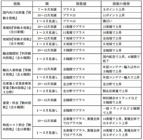 調査項目は「国内向け出荷動向」「輸送機関別利用動向」「輸出入貨物の動向」「在庫量と営業倉庫利用の動向」「運賃・料金の動向」「物流コスト割合の動向。