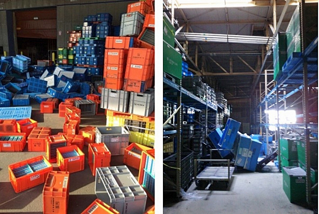なお、この写真は2016年4月14日熊本地震の際の、某機械製造工場内の様子。地震によって、工場内に積み重ねてあったケースが崩れ、部品やケースが散乱してしまった。また、高い棚の上に載せていたパレットが崩れ落ちてきた。近くに人がいたら大惨事になるところ。 通路上に物が散乱し、 避難経路を塞いでいる。