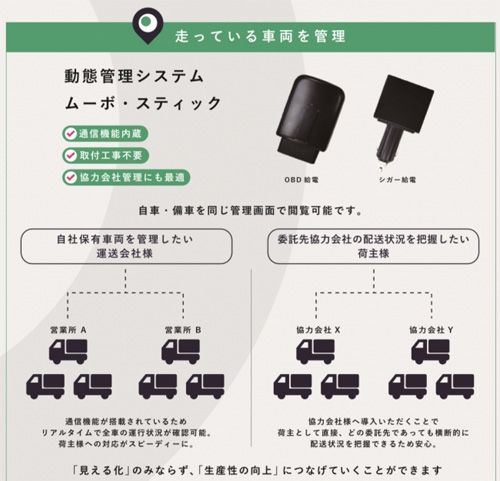 「MOVO動態管理システム」は専用端末をトラックのポートに差し込むだけで、取付工事不要・低価格で、リアルタイムに車両位置情報の管理が導入可能。