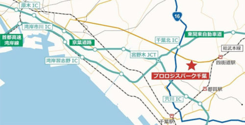 「プロロジスパーク千葉1、2」の開発地は、千葉湾岸エリアから約6kmに位置し、国道16号と東関自動車道の結節地点に位置する。東関東自動車道千葉北ICから約3㎞、京葉道路穴川ICからも約4㎞と至近。