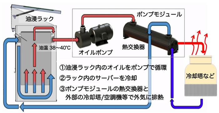 GRC社のHashTankシリーズは、油浸ラック+ポンプモジュールの構成を20フィートあるいは40フィートコンテナに内蔵しており、従来の空調・防湿・防塵・UPS等の設備が不要な冷却システム。