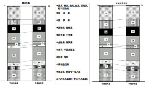 業種別(大分類)では、請求件数は「医療、福祉」313件、「製造業」308件、「卸売業、小売業」232件の順に多く、支給決定件数は「製造業」87件、「医療、福祉」82件、「卸売業、小売業」65件の順に多い。