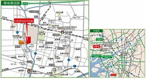 「LOGIFRONT尼崎」は、大阪市中心街から8km圏内に位置し、阪神高速道路尼崎西ICより約3km、名神高速道路尼崎ICより約2kmと、関西エリア全体を網羅する広域配送の物流拠点として最適の立地。