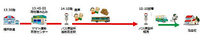 取り組みは、越前市と池田町を結ぶ路線バスを利用して宅急便を輸送し、ヤマト運輸のセールスドライバー(SD)が、ヤマト運輸芝原センターで、池田町の顧客に配達する宅急便を路線バスに積み込む。