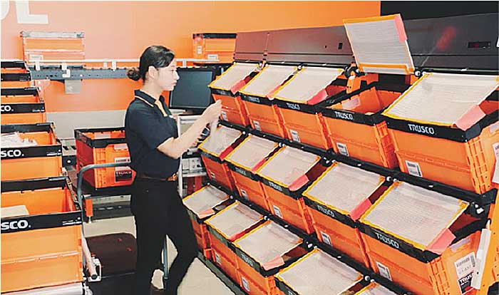 商品仕分け時に該当するコンテナの蓋が開くことで、人的な仕分けミスを削減し、仕分スピードの向上に寄与する。