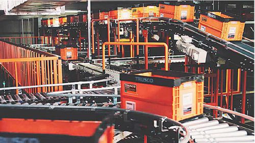システマストリーマーは各階でピッキングされたコンテナに入った商品を効率的に一時保管するための高速荷合わせ装置。1時間に1200個の入出庫が可能だ。