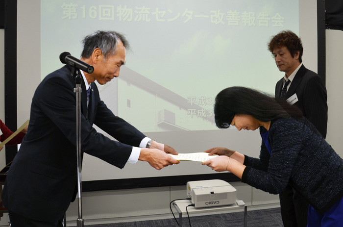 1位には、埼玉物流センター等7物流センターの改善が選ばれた。概要は、それぞれの物流センターにおける改善活動の結果、バラバラとなっていた作業手順を全国で統一化。モデルセンターにおいて研修会を開催し、その統一した標準作業手順を他センターへ展開したもの。