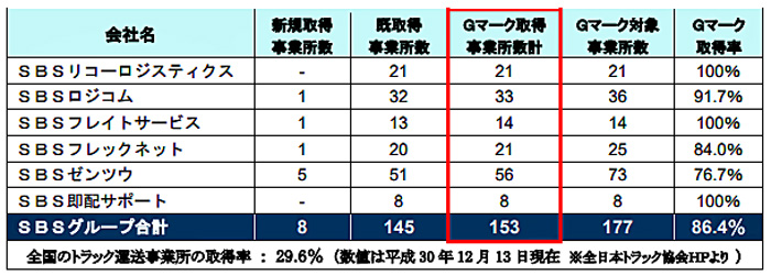 SBSホールディングスは1月15日、全日本トラック協会が昨年12月に実施した貨物自動車運送事業安全性評価事業(Gマーク制度)2018年度安全性優良事業所の評価で、新たに8事業所が認定を受けたと発表した。