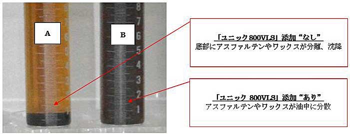 「ユニック800VLS」は日本初の適合燃料油向け添加剤で、適合燃料油に含まれる特有の成分(アスファルテン、ワックス)を効率よく分散して固形化を抑制することで、適合燃料油特有の性質によって起こり得る事故を未然に防止し、安全運航に寄与する。