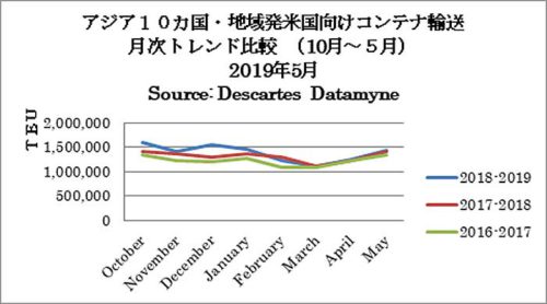 5月のアジア主要10か国・地域発米国向け(往航)は、前年比1.4%増の144万TEUで、1-5月の累計は0.9%増の650万TEUとなった。