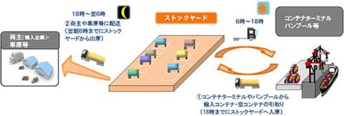 都内で交通混雑が予想される日中にコンテナターミナルから輸入実入コンテナ、バンプールから空コンテナを搬出してストックヤードに仮置きした後、東京2020大会の交通需要が少ない夜間・早朝の時間帯に荷主や車庫などへ配送し、夜間・早朝の貨物搬出入を促進させる狙い。