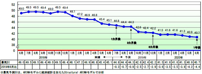 それによると、2019年6月の景気DIは前月比0.3ポイント減の45.1となり、7か月連続で悪化した。国内景気は、輸出の停滞や高水準で推移するコスト負担が引き続き下押し圧力となり、後退局面入りの可能性がある。今後の国内景気は、消費税率引き上げによる消費減退とともに、米中貿易摩擦の先行きも懸念され、不透明感が一層強まっている。