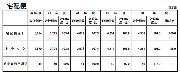 国土交通省は10月1日、2018年度の宅配便取扱個数は、43億701万個(うちトラック運送は、42億6061万個、航空等利用運送は、4640万個)だったと発表した。