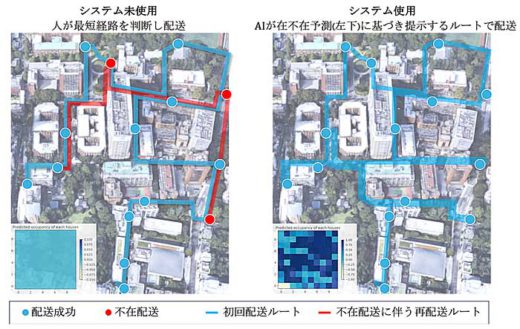システムを用いる場合と用いない場合で2輪車による配送を繰り返した結果、システムを用いた場合の配送成功率は98%となり、不在配送は91%減少、総移動距離を5%減少できた。