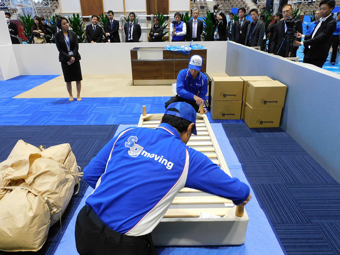 8回目の実施を迎えた今回は、パートナー企業を含め、全国で予選を勝ち抜いた営業所代表11チーム、計22名の選手が出場。大型家具と家電を梱包・組立(スライド丁番調整)・搬入する「複合競技」に参加し、審査員による採点と来場者による投票得点の合計点で順位を競った。