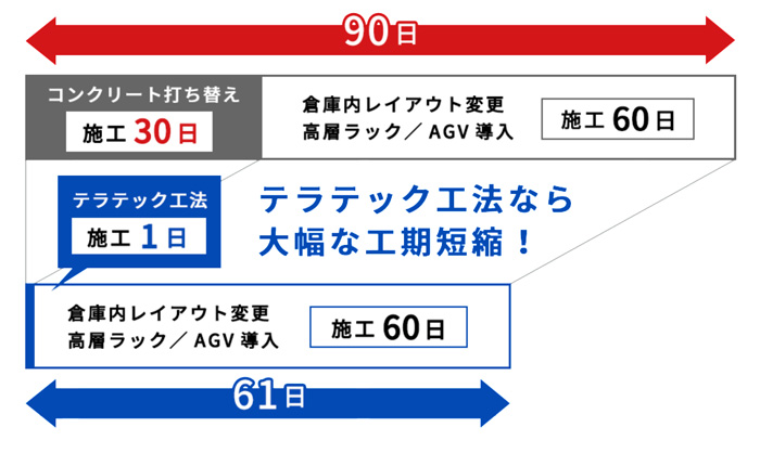 <テラテック工法とコンクリート打ち替え工法の納期の差>