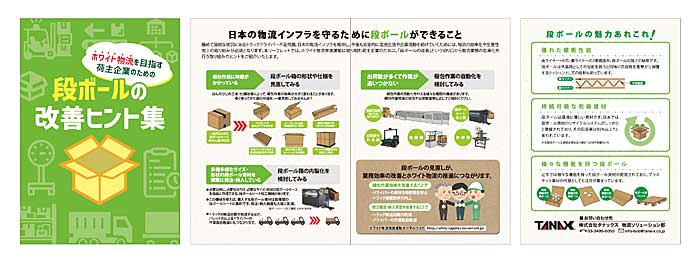 タナックスは2月5日、段ボールの改善によって荷主企業の「ホワイト物流」推進をサポートするリーフレット「ホワイト物流を目指す荷主企業のための段ボールの改善ヒント集」を発行したと発表した。