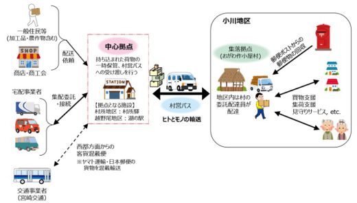 西米良村の小川地区(2月時点での総世帯数55世帯・人口87人)は高齢化率が約58%と高く、人口減少によって村営バスの運営が厳しい状況にあると同時に、宅配事業者にとっても集配効率の低下が課題になっている。同地で貨客混載と宅配荷物の共同配送に取り組むことで、小川地区での輸送系サービス水準を維持するとともに、村営バス運行関係者と宅配事業者の負担軽減を図る。