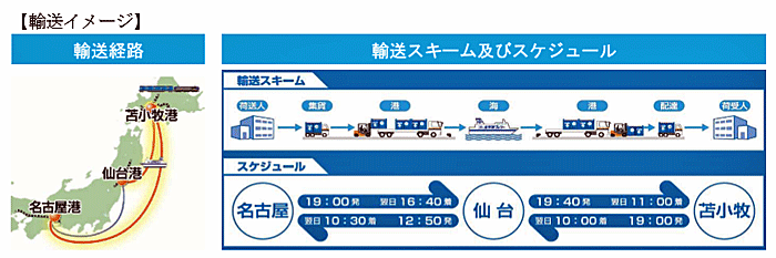 新サービスでは、従来の名古屋港⇔仙台港間の輸送に苫小牧港が加わり、利便性が向上することが一番の特徴。また、人手不足による慢性的な輸送力不足の解消を図るとともに、顧客ニーズに応じた多様な提案により安心で確実な輸送を実現する。