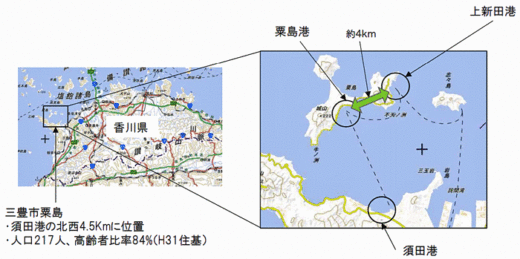 香川県三豊市(粟島)では、定期便に合わせ郵便物等も届けられるが、よりニーズに合わせ、自由な物流を確保したい。また、天候により汽船が運航休止になった場合、物流もストップするため、食料、医薬品等、有事の物流サービス確立が求められている。