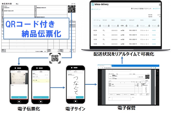 このサービスは、荷物の受け渡し時に、「telesa-delivery」から印刷された納品伝票に記載のQRコードをスマホアプリでスキャンすることで、伝票の受払を電子データとして保存・管理するもの。