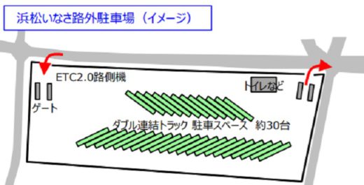 実験は、路外駐車場とSA・PAの計6か所で実施。新東名高速道路「浜松いなさIC」では、料金所外に30台分の駐車場を整備し、ETC2.0による入退出管理をおこなう予約駐車システムの試行を2020年度末に予定している。